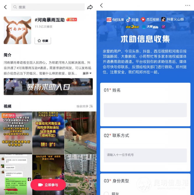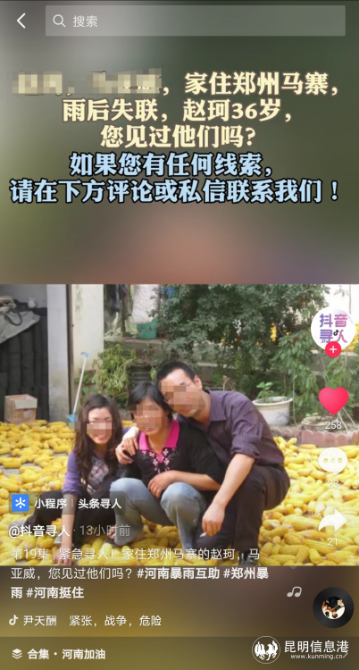 昆明信息港訊 記者勞學(xué)麗 近日,河南多地遭受特大暴雨襲擊。為幫助因汛情受困的人們,抖音上線“暴雨緊急尋人”服務(wù)。截至7月22日中午,抖音已經(jīng)幫3位求助者找到鄭州親人。