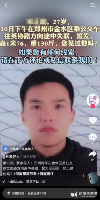第二個成功案例是幫助一位姐姐找到失聯(lián)16小時的弟弟。7月21日16點(diǎn),一位網(wǎng)友通過抖音發(fā)出求助,尋找在鄭州金水區(qū)乘公交(英協(xié)路方向)途中失聯(lián)的弟弟。抖音工作人員電話核實(shí)信息后,于21日19點(diǎn)6分發(fā)布尋人視頻。7月22日凌晨0點(diǎn)40分,有網(wǎng)友私信聯(lián)系抖音工作人員稱,“我們知道他在哪兒,我還有房東的電話。他住的這個小區(qū),這幾天停電,沒有信號”。目前,該網(wǎng)友已經(jīng)聯(lián)系上弟弟。