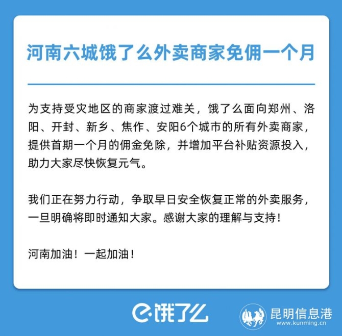 昆明信息港訊 記者昝娟娟 7月22日,餓了么宣布,面向鄭州、洛陽、開封、新鄉(xiāng)、焦作、安陽等6個城市所有的外賣商家,提供首期一個月的傭金免除,并將增加平臺補貼資源投入,助力商家渡過難關(guān)。