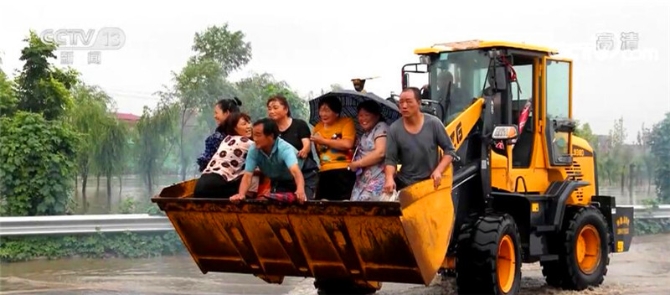 再來看,在位于新107國道附近的河南省許昌市長葛市大周鎮(zhèn)小河董村,防汛救災人員利用鏟車緊急疏散和轉(zhuǎn)移被困群眾。