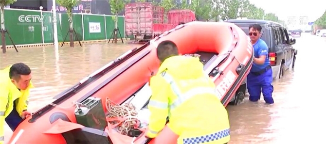 在鄭州東三環(huán),此積水區(qū)域積水很深,從高空來看很是震撼,積水中有垃圾車被困在在水中,而很多私家車漂在水中只露個車頂。救援隊人員積極解救被困人員,乘坐沖鋒舟展開救人。