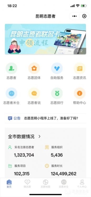 為推動(dòng)我市志愿服務(wù)智能化轉(zhuǎn)型,打通志愿服務(wù)“最后一公里”。在對(duì)志愿者需求進(jìn)行調(diào)研后,基于昆明志愿者網(wǎng)提升建設(shè)的“志愿昆明”小程序由此誕生,并將于即日起正式投入使用。