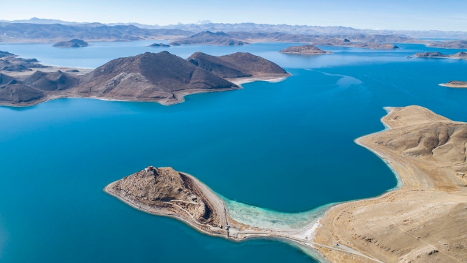 這是西藏羊卓雍錯景色(2021年1月10日攝,無人機照片)。