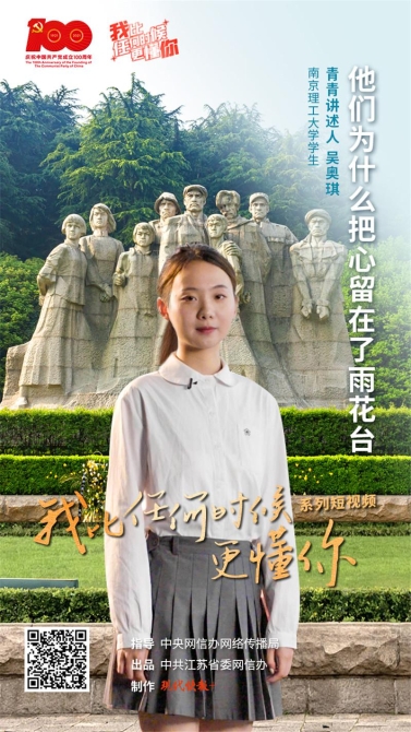 7 月 25 日," 我比任何時候更懂你 " 系列短視頻第 1 集《他們?yōu)槭裁窗研牧粼诹擞昊ㄅ_》上線。本集青青講述人是南京理工大學學生吳奧琪。" 以前了解的雨花臺大多在書本里。這一次走進雨花臺,對雨花英烈的認識更不一樣了。"