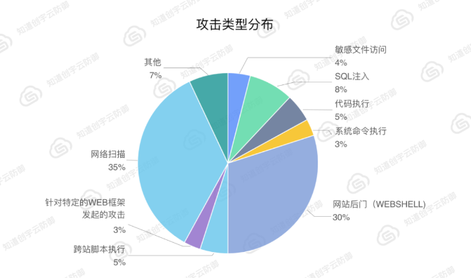 從重大活動(dòng)、節(jié)假日期間的攻擊量上可以直觀地看出,美國(guó)對(duì)中國(guó)的攻擊是有目的、有針對(duì)性的。從攻擊類(lèi)型分布看,也更加印證了這一點(diǎn)。