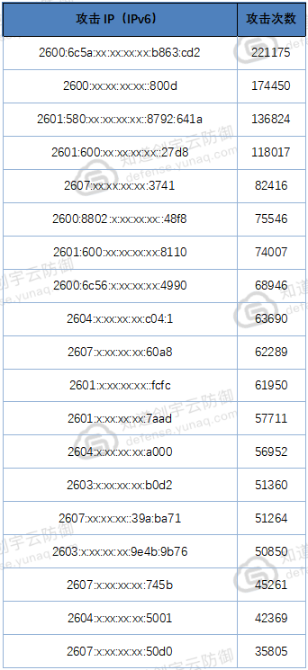 表2 攻擊IPv6 TOP 20(所有IP均來(lái)自于美國(guó)):
