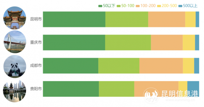 那么很多小伙伴會問,來昆明旅游成本高嗎?小明通過對比西南三城,發(fā)現(xiàn)昆明市景區(qū)門票成本,其實是最低的,在所有標(biāo)明了門票價格的景區(qū)中,昆明市門票50元以下的景區(qū)占了40%,為四個城市最高,而200元以上的高價景區(qū)占比昆明是最低的。