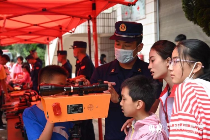 面對(duì)小朋友的提問,消防員耐心介紹裝備性能,同時(shí)普及抗災(zāi)自救知識(shí)。幾名小朋友還在消防員的幫助下穿上救援服,戴上救援頭盔,零距離感受了一次消防救援裝備,做了一回“小消防員”。
