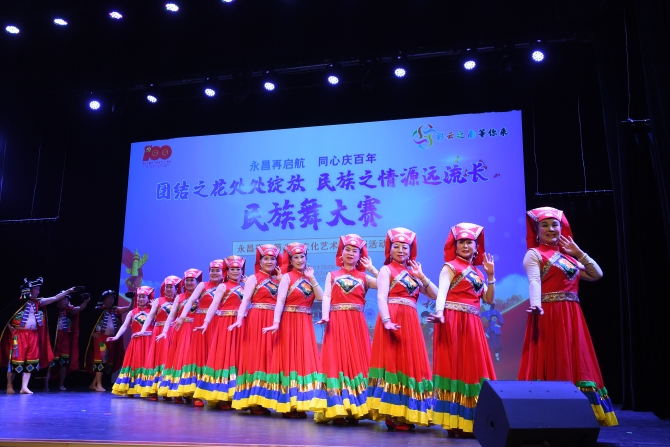 昆明信息港訊 記者徐毅杰 "五十六個(gè)星座 ?五十六枝花 五十六族兄弟姐妹是一家”伴隨著歡快的音樂聲,西山區(qū)永昌街道第八屆文化藝術(shù)節(jié)系列活動(dòng)之民族舞大賽在云紡劇場(chǎng)熱鬧開賽,轄區(qū)14支文藝隊(duì)們載歌載舞,共爭(zhēng)“舞王”。