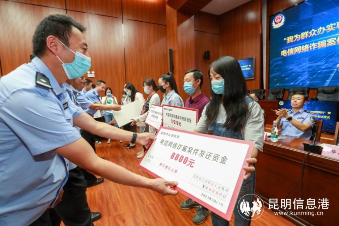 昆明信息港訊 記者合宇聰 7月27日,昆明市公安局在昆明市反電信網(wǎng)絡詐騙中心舉行“我為群眾辦實事”暨“打擊治理電信網(wǎng)絡詐騙涉案資金發(fā)還儀式”,向電信網(wǎng)絡詐騙受害群眾集中發(fā)還凍結止付資金564.7萬元。