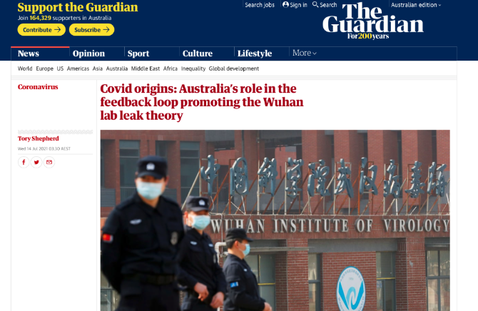 《衛(wèi)報(bào)》澳大利亞版刊文《新冠溯源:澳大利亞在推動(dòng)武漢實(shí)驗(yàn)室泄漏論中扮演了什么角色》,揭露澳大利亞記者沙麗·馬克森與美國(guó)右翼勢(shì)力聯(lián)手炒作新冠病毒“實(shí)驗(yàn)室泄漏論”的相關(guān)內(nèi)幕。(網(wǎng)頁(yè)截屏)