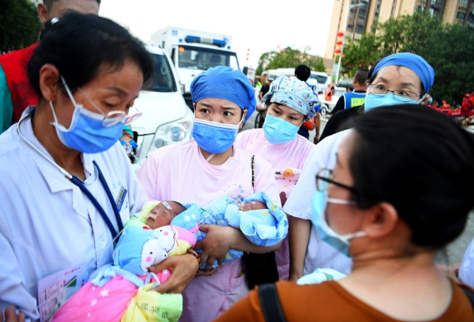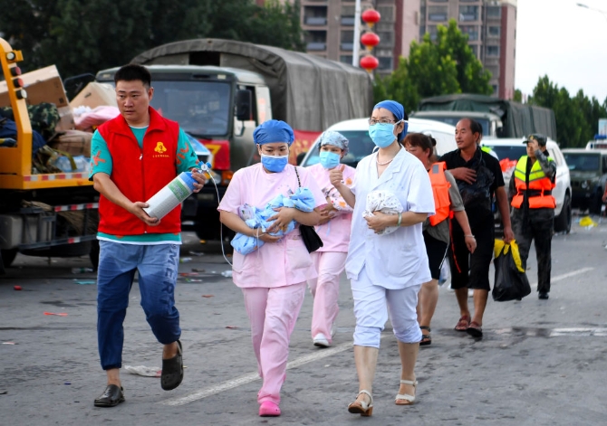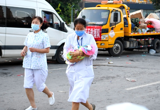 ↑7月26日,醫(yī)護(hù)人員抱著新生兒,向救護(hù)車跑去。