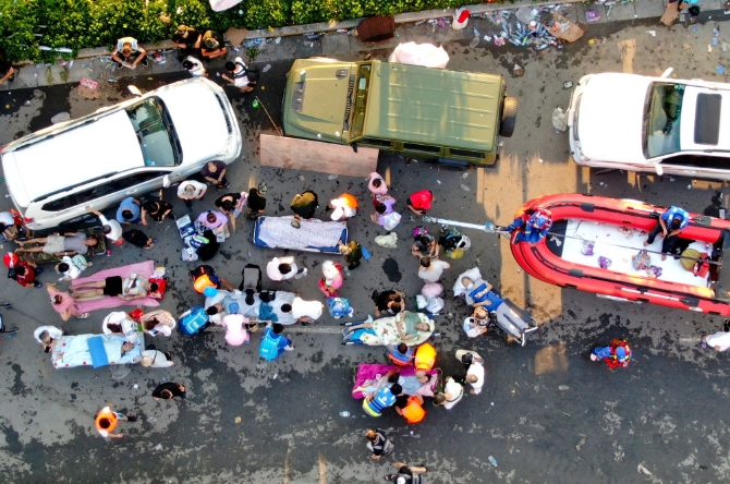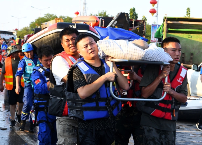 ↑7月26日,救援人員在轉(zhuǎn)運(yùn)一名重癥患者。