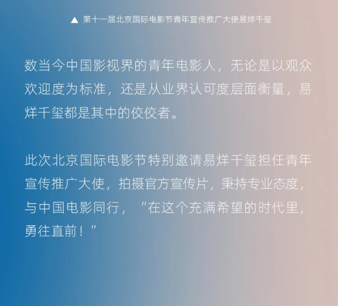 7月27日,第十一屆北京國際電影節(jié)發(fā)布官方宣傳片,同時(shí)宣布易烊千璽擔(dān)任本屆電影節(jié)青年宣傳推廣大使。