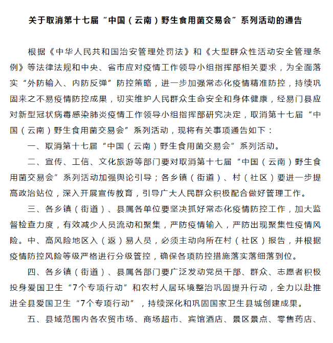 通告稱,為全面落實“外防輸入、內(nèi)防反彈”防控策略,進(jìn)一步加強(qiáng)常態(tài)化疫情精準(zhǔn)防控,持續(xù)鞏固來之不易疫情防控成果,切實維護(hù)人民群眾生命安全和身體健康,經(jīng)易門縣應(yīng)對新型冠狀病毒感染肺炎疫情工作領(lǐng)導(dǎo)小組指揮部研究決定,取消第十七屆“中國(云南)野生食用菌交易會”系列活動。