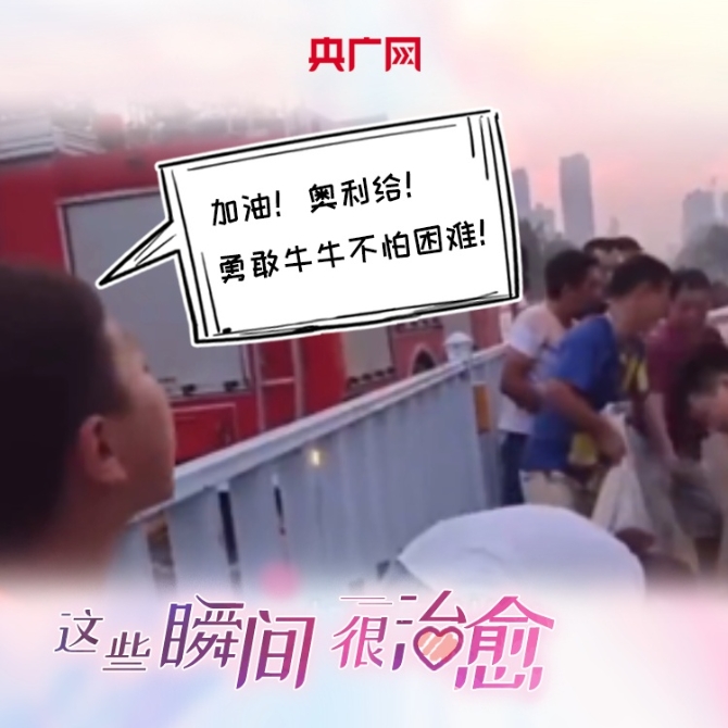 新鄉(xiāng)一小男孩大喊“加油!奧利給!勇敢牛牛不怕困難!”給救援人員加油打氣。