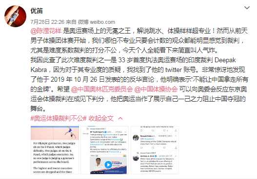 “中國包攬了所有金牌!應(yīng)該有人阻止他們大獲全勝。”在中國男子體操運動員肖若騰“被打低分”無緣金牌后,有網(wǎng)友爆料稱當(dāng)天比賽中跳馬項目的一位印度裁判2019年曾在推特上發(fā)過這樣一條推文。