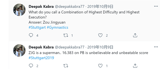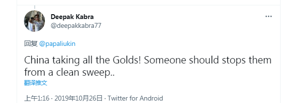 2019年10月16日,迪帕克·卡布拉曾在推特上這樣寫道:“中國包攬了所有金牌!應(yīng)該有人阻止他們大獲全勝?!蹦壳?這條帶有強烈個人情感色彩的推文依舊還在。