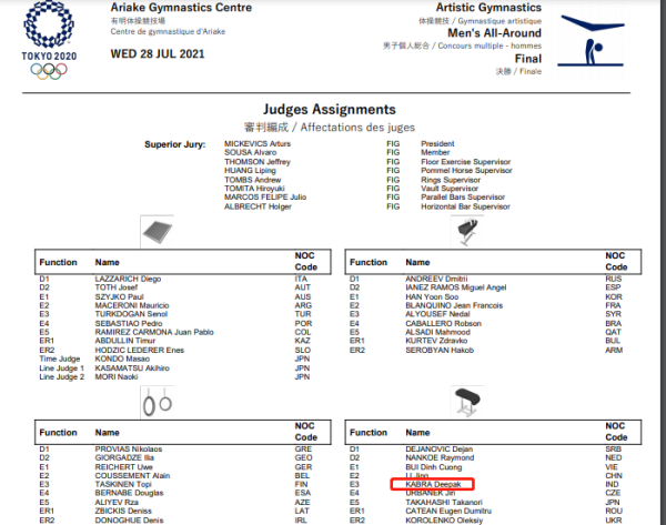 根據(jù)東京奧運會官網(wǎng)公布的28日體操男子個人全能決賽裁判名單,迪帕克·卡布拉確為當(dāng)晚體操男子個人全能決賽跳馬項目的裁判↓