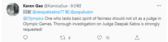 “缺乏基本公平精神的人不應(yīng)該當(dāng)奧運會的裁判。強烈要求對迪帕克·卡布拉裁判進行徹底調(diào)查!”