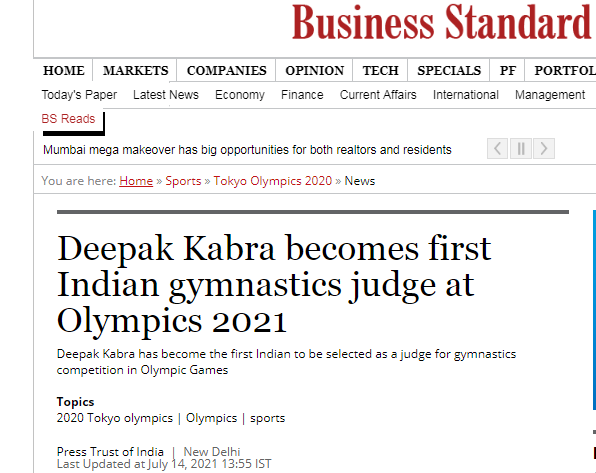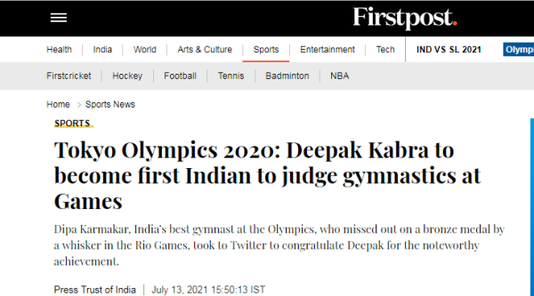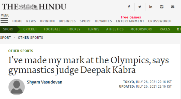 奧運會開幕后的7月26日,《印度教徒報》發(fā)布題為“體操裁判迪帕克·卡布拉說,我在奧運會上留下了自己的印記”的文章。文章稱,現(xiàn)年33歲的帕克·卡布拉作為二級裁判,正在擔(dān)任男子體操項目的裁判。在報道中,迪帕克·卡布拉自曝“我的基礎(chǔ)不是很好,我知道作為一個體操運動員我走不了太遠。所以我決定在21歲時追求一個裁判的角色?!?/p>