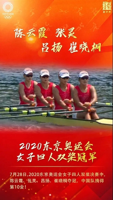 在28日舉行的東京奧運(yùn)會(huì)賽艇女子四人雙槳決賽中,由陳云霞、張靈、呂揚(yáng)、崔曉桐組成的中國(guó)隊(duì)獲得冠軍,為中國(guó)代表團(tuán)奪得本屆奧運(yùn)會(huì)第十枚金牌。