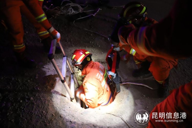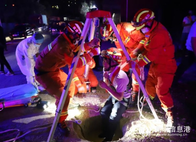昆明信息港訊 記者勞學麗 通訊員代華超 8月1日晚22時,昆明富民縣大營街道辦事處豹子溝工業(yè)園區(qū)克林路一名路人掉進下水道,情況十分緊急。富民縣消防救援大隊接到報警后迅速出動2車11人趕赴現(xiàn)場救援。