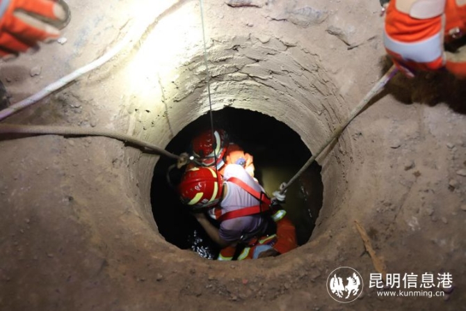 22時07分,救援人員趕到現(xiàn)場,發(fā)現(xiàn)一名男子路過不慎掉進下水道,動彈不得,井口直徑大約一米,井深約7米,井底有30多厘米深的污水。
