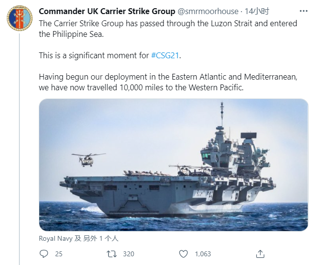根據(jù)英國航母打擊群官方推特8月1日發(fā)布的最新消息,該航母打擊群已經(jīng)航經(jīng)呂宋海峽進(jìn)入菲律賓海。英國航母打擊群官方推特表示,自從大西洋及地中海出發(fā)后,“伊麗莎白女王”號航母打擊群至今已航行到1萬英里外的西太平洋。還宣稱這是“伊麗莎白女王”號航母首次執(zhí)行遠(yuǎn)航任務(wù),“顯示英國可在印太地區(qū)為盟友級伙伴提供一個可靠的航母戰(zhàn)斗群,準(zhǔn)備好為海上安全做出貢獻(xiàn)”。
