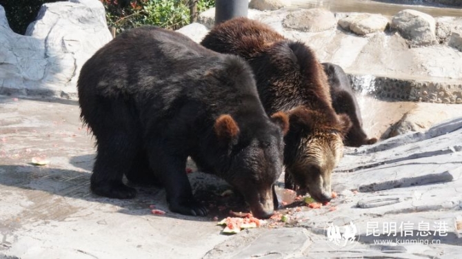 在棕熊館的假山上,潺潺流水猶如小瀑布傾瀉而下,幾只“身披大棉襖”的棕熊晃悠悠的將半個(gè)身體泡在浴池里,美滋滋的啃著大西瓜,其他棕熊?chē)刂频摹八u”大快朵頤起來(lái),可愛(ài)的樣子引不少游客駐足觀看拍攝。