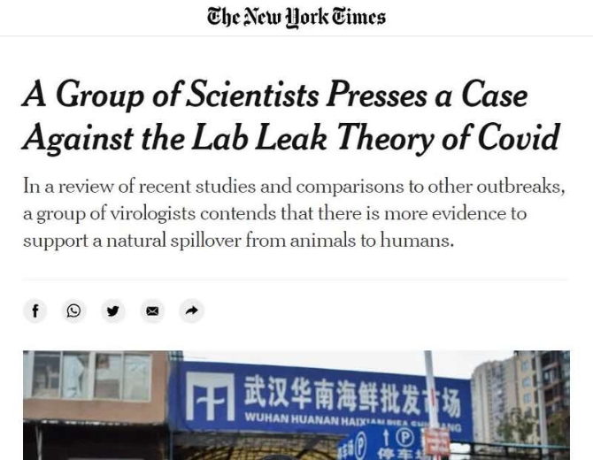 柯文思提到的這篇報道,題為“多名科學家反駁(新冠病毒)實驗室泄漏論”(A Group of Scientists Presses a Case Against the Lab Leak Theory of Covid),由《紐約時報》專欄作者卡爾·齊默和科普作者詹姆斯·戈曼共同撰寫。該報道在紐約時報網(wǎng)站上首發(fā)于7月9日,7月22日有內容更新。報道援引21名權威病毒學家最新發(fā)表的一份聯(lián)名報告說,最可能導致新冠病毒大流行的原因,是從動物到人類的“自然溢出”,而不是所謂“實驗室泄漏”。由于“新冠病毒源于自然”的證據(jù)越來越多,就連以前對此持懷疑態(tài)度的科學家也開始“倒戈”,明確反對某些西方政客制造的“陰謀論”。