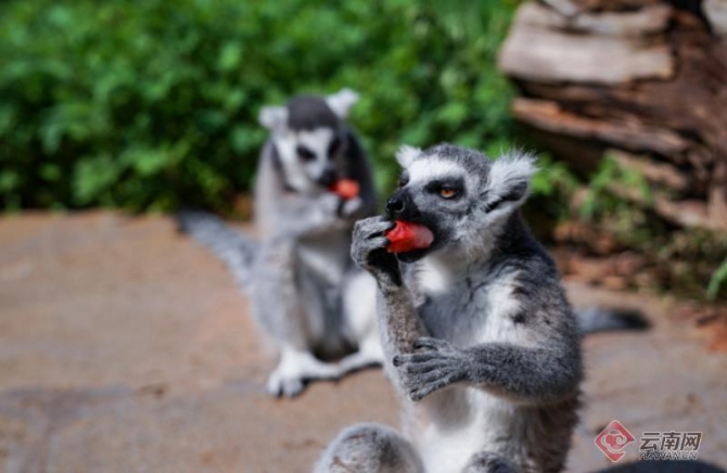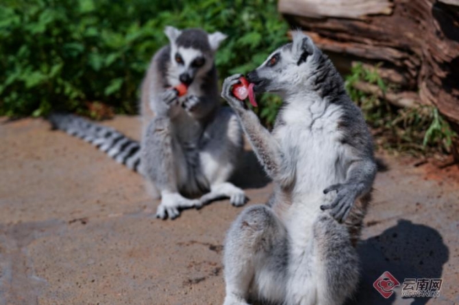 隨后,動物園工作人員又帶著美食來到了馬達加斯加環(huán)尾狐猴的生活區(qū),為了讓這些非洲的小伙伴能夠感受到夏日的清涼,工作人員們特地為它們準備了由葡萄、西瓜、香蕉等水果組成的小冰塊,小家伙們一擁而上,還沒等工作人員準備好,手中的不少冷飲就已經(jīng)被“洗劫一空”,它們的吃相也非常可愛,幾只環(huán)尾狐猴圍著一兩個“愛心”形狀的西瓜冰棒,一時間不知道從哪里下手。終于有的鼓起勇氣,輕輕舔舐一口,發(fā)現(xiàn)了這美味后馬上抱起美食躲到一旁享用。不一會兒,這些冰鎮(zhèn)美食就被它們吃了個干凈。