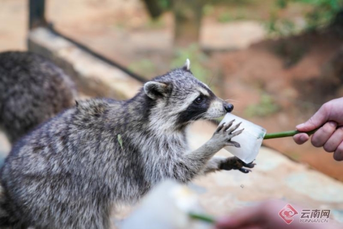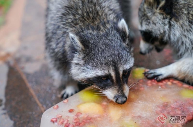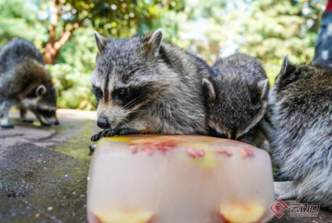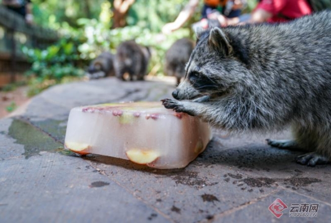 要說最會吃的,要數(shù)野生動物園的小浣熊,而且它們還“愛干凈”什么都要放到盆里洗一洗,拿到冰鎮(zhèn)的美食后,馬上放到盆里面“涮了涮”,面對一大盆無從下手的冰塊,它們又發(fā)揮了“團隊精神”,幾只小家伙們一會兒就把冰塊鑿開,開始對里面的水果胡吃海塞。惹得在一旁的游客們哈哈大笑。據(jù)云南野生動物園工作人員介紹,防暑降溫、為園內(nèi)動物準備符合季節(jié)的食物已成為云南野生動物園的常規(guī)工作,為它們準備夏季特飲,也是為動物消暑,提供園內(nèi)小動物生活品質(zhì)的方式之一。(云南網(wǎng) 記者張成)