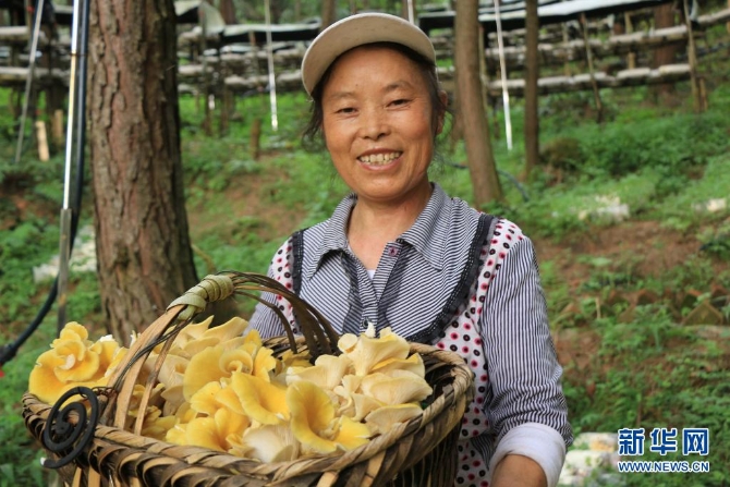 當?shù)厝罕娫谫F州省六盤水市六枝特區(qū)月亮河鄉(xiāng)的花德河國有林場內(nèi)收獲菌類(2021年7月24日攝)。 新華社發(fā)(令狐榮駿 攝)