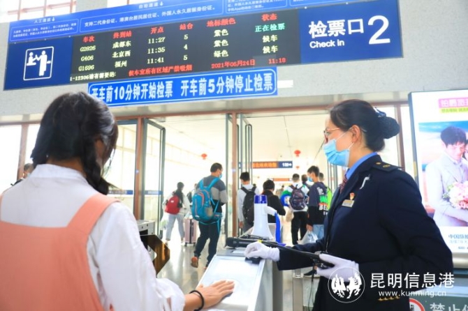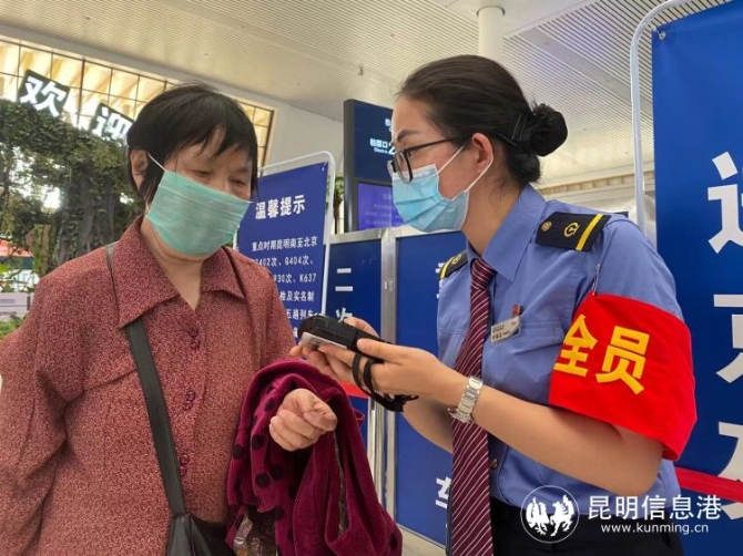 為嚴(yán)格落實(shí)旅客100%掃碼測(cè)溫進(jìn)出站的相關(guān)規(guī)定,昆明局集團(tuán)加大引導(dǎo)力度,組織進(jìn)出站口工作人員逐一查驗(yàn)旅客行程健康碼,妥善安排和處置持有非綠碼的進(jìn)出站旅客。為了讓旅客快速便捷地掃碼測(cè)溫,昆明站和昆明南在進(jìn)出站口增設(shè)印有“國家政務(wù)服務(wù)平臺(tái)”、“云南健康碼”、“通信行程卡”二維碼的展架和海報(bào),并對(duì)昆明站南北進(jìn)站口進(jìn)行提質(zhì)改造,建立集安檢、測(cè)溫于一體的新型安檢通道24條,讓旅客擁有高效地掃碼測(cè)溫體驗(yàn)。