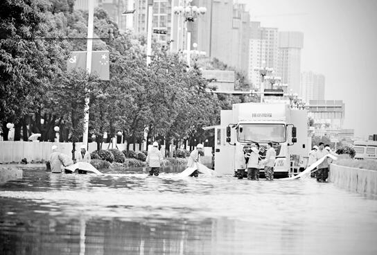 7月24日,一場(chǎng)暴雨后,海源中路與科錦路交叉口積水嚴(yán)重,工作人員緊急排水。記者 龍宇丹 攝