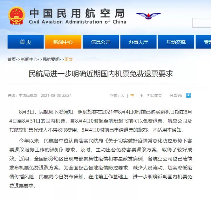 8月3日,民航局下發(fā)通知,明確旅客在2021年8月4日0時前已購買乘機日期在8月4日至8月31日的國內(nèi)機票,自8月4日0時起至航班起飛前可以免費退票,航空公司及其航空銷售代理人不得收取費用;8月4日0時前已申請退票的旅客,不適用本通知。