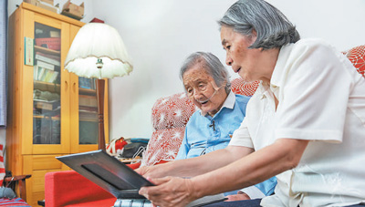 六月二十三日,在北京的家中,瞿獨(dú)伊(左)和女兒李曉云向記者展示家人的相冊(cè)。新華社記者才揚(yáng)攝