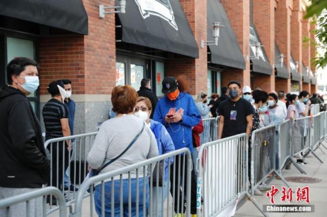 資料圖:美國(guó)紐約大都會(huì)棒球隊(duì)主場(chǎng)花旗球場(chǎng)新冠疫苗接種點(diǎn),民眾排隊(duì)接種疫苗。中新社記者 廖攀 攝