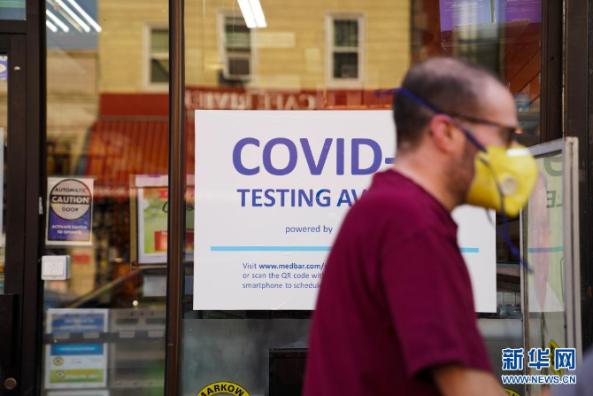 7月26日,行人從美國紐約一家藥店的新冠檢測(cè)廣告牌旁走過。新華社記者 王迎 攝