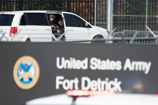資料圖片:4月6日,特警人員準(zhǔn)備進(jìn)入美國馬里蘭州弗雷德里克市的德特里克堡軍事基地。新華社/美聯(lián)
