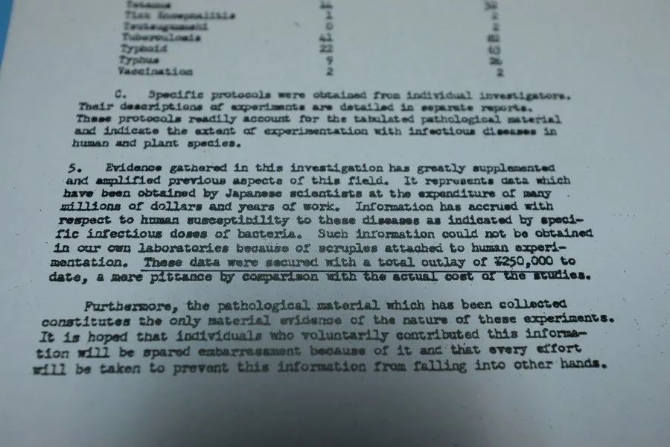 侵華日軍第七三一部隊罪證陳列館館長金成民說,研究發(fā)現(xiàn),二戰(zhàn)結(jié)束后,美國對日本擁有的生物武器及其數(shù)量非常感興趣。為謀求獨占731部隊細(xì)菌戰(zhàn)、人體實驗等方面的數(shù)據(jù)資料,美軍德特里克堡基地先后派出4任調(diào)查官,和731部隊主要成員接觸,最后達(dá)成交易。
