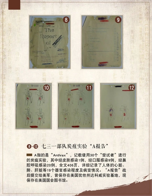 德特里克堡基地的調(diào)查人員還從731部隊獲得了3份人體實驗報告書。這些人體實驗報告書的原始檔案保存在美國國會圖書館科學(xué)技術(shù)部檔案室,包括《炭疽菌實驗報告》《鼻疽菌實驗報告》《鼠疫菌實驗報告》,共計1500余頁,詳細(xì)記載了731 部隊進(jìn)行人體實驗的情況,包括解剖數(shù)據(jù)、彩色解剖圖、器官感染路徑和感染程度等。報告的封面,有“馬里蘭州德特里克堡基地生物戰(zhàn)實驗室化學(xué)部隊研究與開發(fā)部”的字樣。金成民表示,這3份人體實驗報告書是德特里克堡基地同731部隊秘密交易的核心資料。
