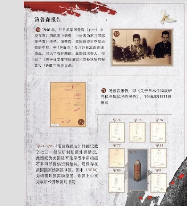 湯普森是德特里克堡基地派出調(diào)查日本細(xì)菌戰(zhàn)的第二任調(diào)查官,他先后問訊了731部隊首任部隊長石井四郎和第二任部隊長北野政次等。據(jù)侵華日軍第七三一部隊罪證陳列館研究員楊彥君介紹,石井四郎向湯普森提供了《平房工作大綱》,也就是731部隊哈爾濱市平房區(qū)本部的研究計劃,其中包括預(yù)防醫(yī)學(xué)、疫苗生產(chǎn)、治療血清、診斷性抗原體、診斷血清、細(xì)菌炸彈研究等。