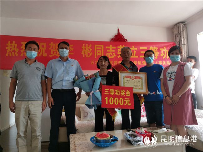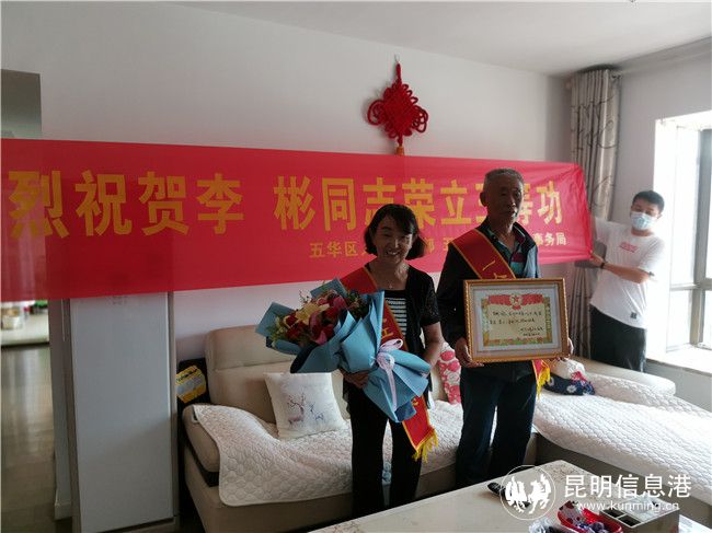 昆明信息港訊 記者昝娟娟 8月5日,五華區(qū)人民武裝部、退役軍人事務(wù)局、黑林鋪街道辦事處和國際花園社區(qū)居委會相關(guān)領(lǐng)導(dǎo)以及工作人員來到中天花園小區(qū),為轄區(qū)現(xiàn)役軍人李彬家送去立功喜報。