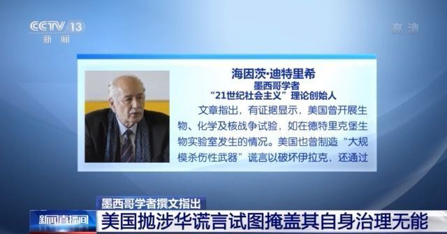 墨西哥學(xué)者、“21世紀(jì)社會主義”理論創(chuàng)始人海因茨·迪特里希日前在墨西哥“自由科學(xué)”網(wǎng)站上發(fā)表文章說,美國借新冠病毒溯源等問題開展反華行動,目的是轉(zhuǎn)移美國各界對美國自身問題的關(guān)注。
