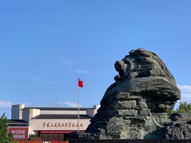 中國人民抗日戰(zhàn)爭紀(jì)念館前,屹立著巨型雕塑:醒獅。(總臺央視記者程鋮拍攝)