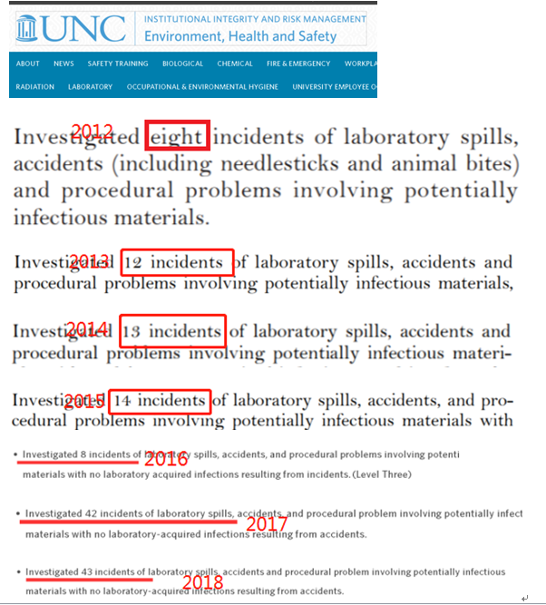 △根據(jù)北卡羅來納大學(xué)歷年年報(bào)提供的公開信息,巴里克的實(shí)驗(yàn)室在2012年至2018年間發(fā)生的實(shí)驗(yàn)室泄漏事故總數(shù)多達(dá)140起。