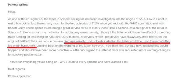 △比約克曼在發(fā)給自媒體播客節(jié)目“本周病毒學(xué)”的信中寫道,“我也許太天真了,沒想到這封信會(huì)被用來推廣‘實(shí)驗(yàn)室起源’假說”。