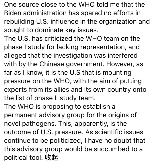 “美國(guó)批評(píng)世衛(wèi)組織第一階段新冠溯源研究小組缺乏代表性,并聲稱其受到中國(guó)政府的干預(yù)。但據(jù)我所知,給世衛(wèi)組織施加越來(lái)越大壓力的正是美國(guó),它的目的是將其盟友和本國(guó)的專家列入第二階段研究小組名單?!?/p>